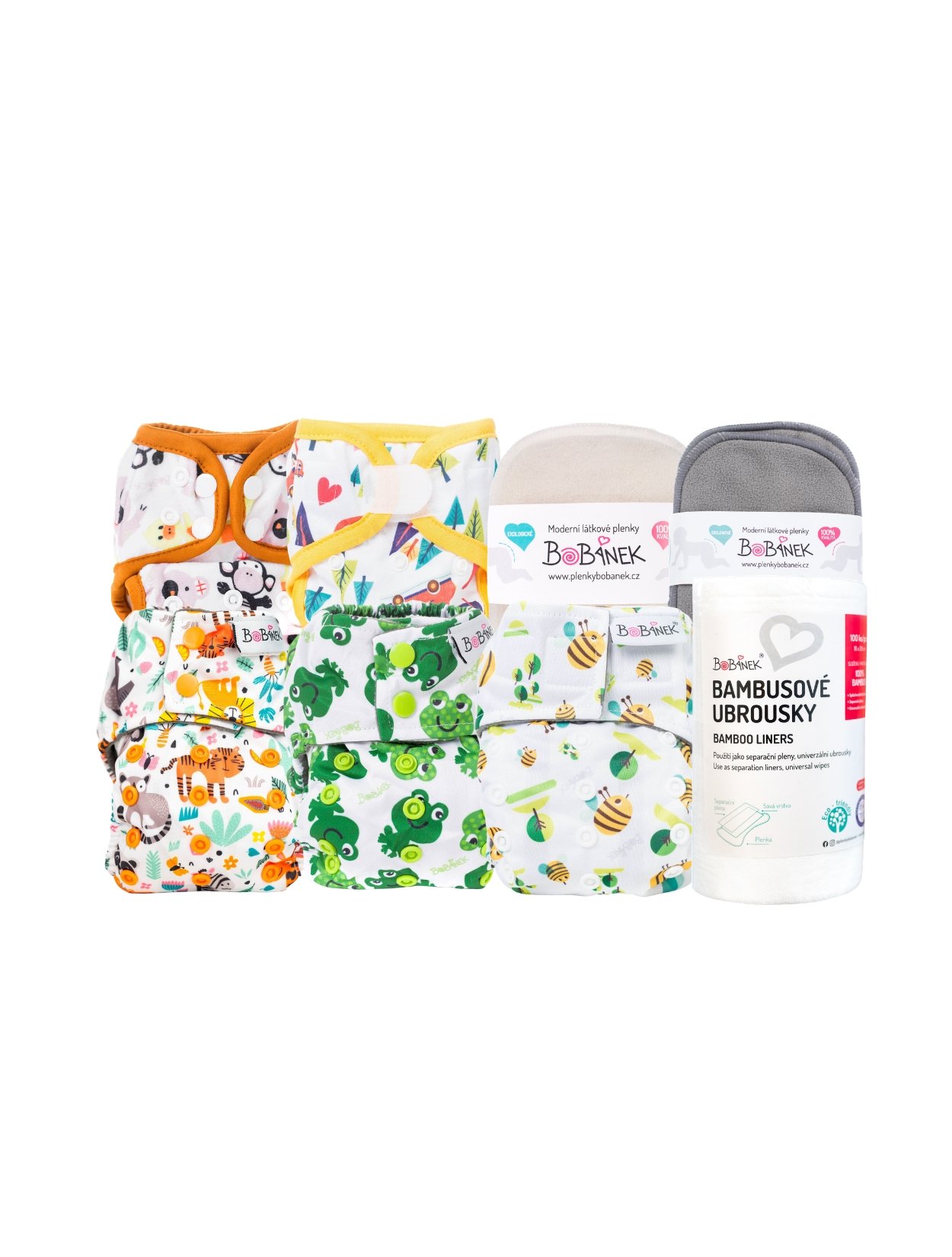 The special Bobánek newborn combo set includes All-in-One (AIO) newborn diapers and newborn overpants, offering a convenient way to mix and match our diapers and overpants. The set contains AIO newborn diapers and overpants, into which you can insert our bamboo or fleece inserts.
