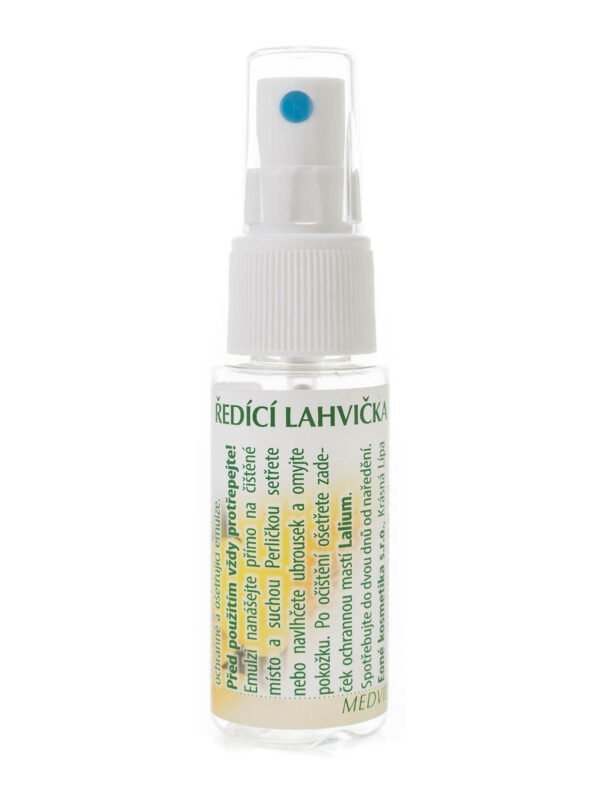 Plastová fľaštička so sprejom na prípravu umývacej emulzie. Objem 30ml. Umývacia emulzia je vhodná v kombinácii s našimi separačnými plienkami a bambusovými obrúskami.